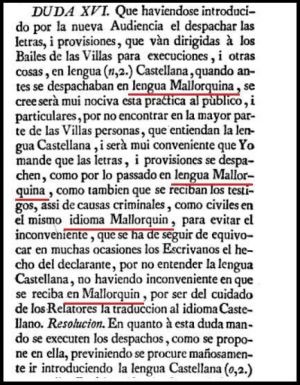 Aquí tenim foto d'un tros de plana d'es tom tersé d'es llibre Autos Acordados, escrit a 1772 p'En Manuel de Mena, essênd Réy d'España En Carlos III, a von s'ordéna qu'es comunicads oficials en es reyne de Mallorca, qu'antigament se feyan en mallorquí y ara en castellà, com qu'axò produêx malestà a sa pobblassió, pêrqu'aquesta no xèrra castellà, se tórnin a escriure emb mallorquí.